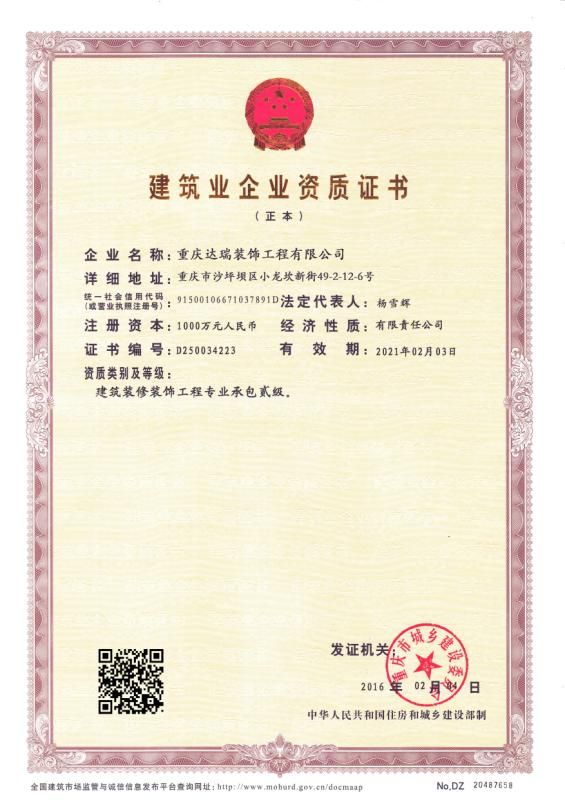 您的位置: 重慶達(dá)瑞裝飾工程有限公司 >> 企業(yè)詳情