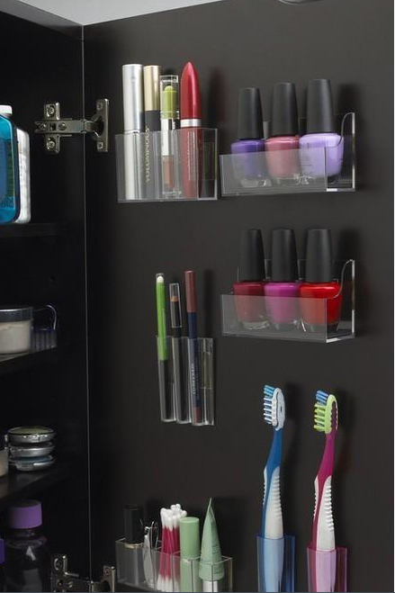 小戶型的衛(wèi)浴間如果只放一面鏡子,就太過(guò)奢侈了,還是鏡柜更加實(shí)用,方便。圖中這位姑娘真是連門(mén)板都不放過(guò),指甲油、眉筆、睫毛膏……一目了然
