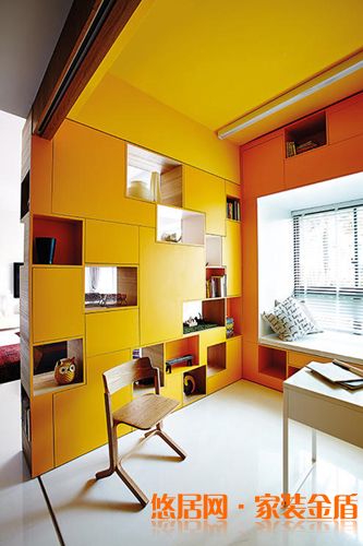 狹長(zhǎng)的邊套房型 設(shè)計(jì)型柜體——半分割空間+全收納。具有超前衛(wèi)實(shí)驗(yàn)性的設(shè)計(jì),同時(shí)也出乎意料的美麗大方,柜體和天花統(tǒng)一的明黃用色,一體又大氣,柜體的不規(guī)則設(shè)計(jì),現(xiàn)代性和都市性更濃。