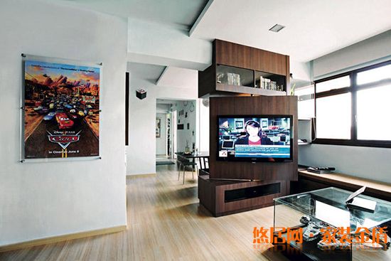 一個(gè)可以旋轉(zhuǎn)的電視背景墻,同時(shí)也是一個(gè)很好的客餐廳隔斷體,令外,這個(gè)背景墻上下兩端的固定部分,還能增加一些收納功能。