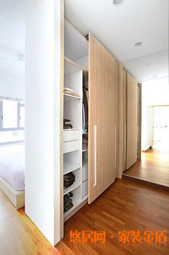 隔斷墻是很死板的,但是隔斷柜就顯得一物多用高效多了,用來隔開臥室的墻體,恰好就是一個(gè)小小的衣物收納柜,加面鏡子,一個(gè)衣物間就有了。