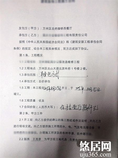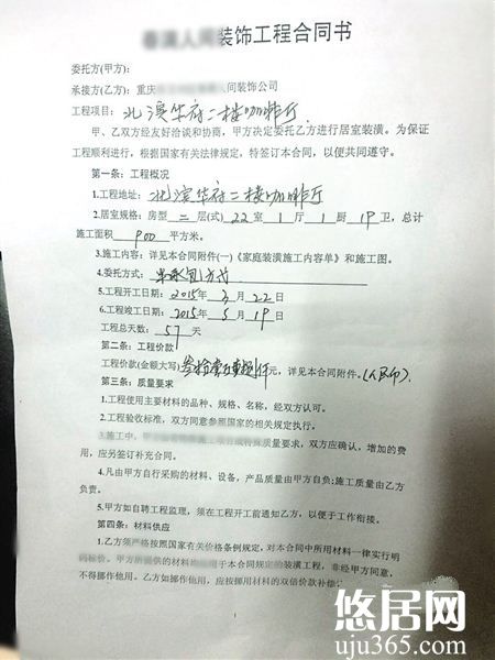 湯先生向記者發(fā)來了第一次裝修時與施工方萬州本地一家裝飾公司簽訂的合同: