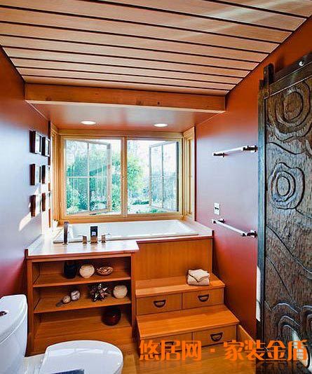 窗臺下的墻體若是足夠厚,也可以進(jìn)行入壁設(shè)計,像這樣入壁的雙層收納架,正好位于浴缸旁邊,放上浴巾以及沐浴要用的洗護(hù)用品,增添了不少便捷。