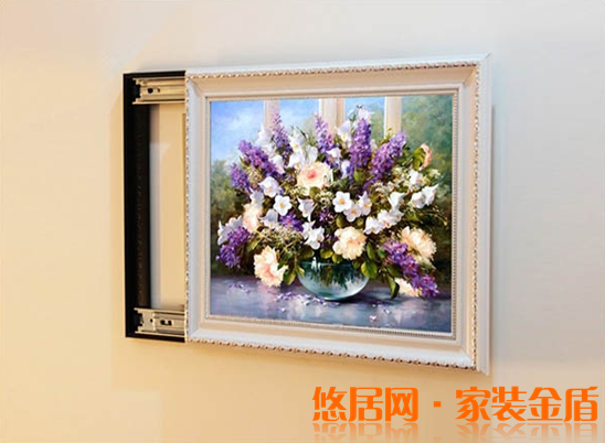 (4)如果配電箱正好在墻面中間,不妨選擇一幅合適的掛畫,把配電箱遮擋起來;若配電箱在墻面上的位置比較偏,又過于明顯,掛畫反而會(huì)顯得別扭,不如考慮造型隱藏。