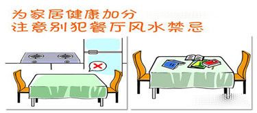 餐桌上方宜平忌壓。若上方屋頂傾斜不平或橫梁壓頂,或位于樓梯底下,均會對家人健康有損,必須設法避免. 橫梁成煞,幾乎略懂風水的人都知道。但橫梁所壓者不同,便有不同的影響,如飯桌上方有橫梁,便做成橫梁壓飯桌了。這會妨礙人的消化能力,久而久之,便招致腸胃病了。