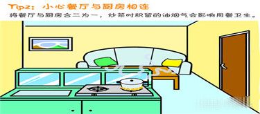 將餐廳與廚房合二為一,是非常不好的。因為炒菜時積留的油煙氣會影響用餐衛(wèi)生。在古籍《陽宅三要》中有云:“開門見灶,錢財多耗”。意思是說爐灶火口對正大門而成一條直線以致有刑克,有此情況的話,則主此家人的財運不吉,有破財之嫌,更會令健康受損。主要注意腸胃病。