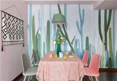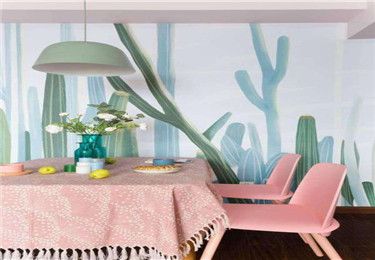 ▲ 整體墻面采用了一種淡淡的水洗粉色調(diào),小餐廳這里用了綠色系的壁紙加上綠色系的吊燈反襯