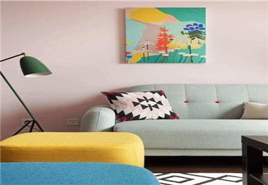 ▲ 客廳灰色的沙發(fā)造型圓潤可愛,背后一幅裝飾畫