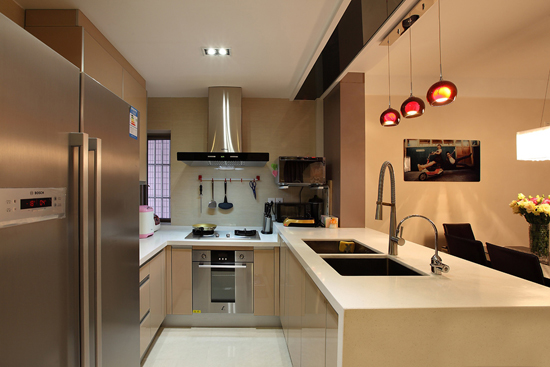如果房間層高比較高,也可以在開放式廚房的正中使用吊燈,四周環(huán)繞射燈。燈的造型一定不要太復(fù)雜,以免給日后的清潔工作帶來麻煩。