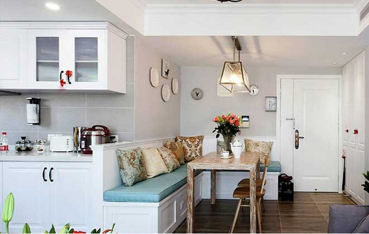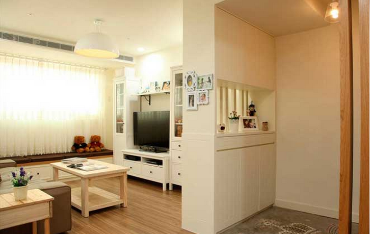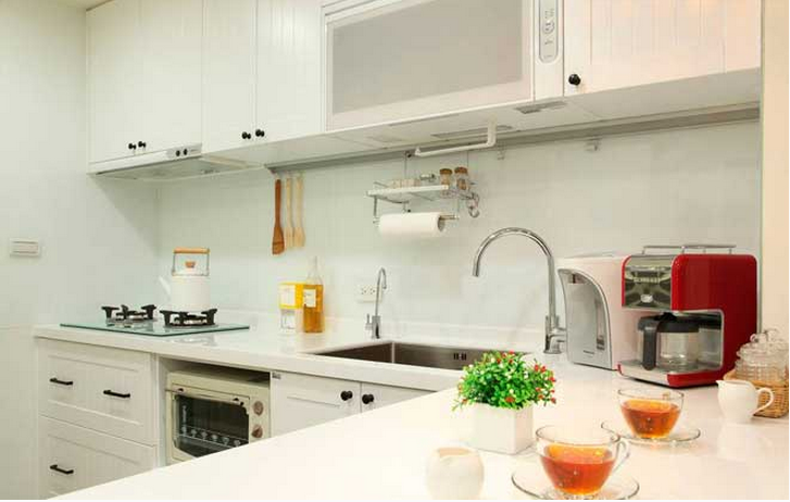 構筑一處以白色為基底的幸福居宅,并注入清新感的鄉(xiāng)村風語匯,讓滿室呈現(xiàn)舒緩的空間暖意。在僅有56平的小小天地中,保留最大的空間給最愛的家人,除了將客、餐廳連貫,增加小孩的游戲空間,并將原有的廚房隔間打掉,以開放式、中島吧臺的餐廚空間來表現(xiàn)。