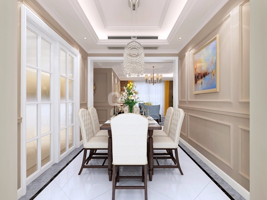 餐廳的裝修設(shè)計(jì)跟隨客廳設(shè)計(jì),造型簡(jiǎn)約,減少雕花等復(fù)雜的裝飾,采用線條裝飾,同時(shí),空間色彩統(tǒng)一,在視覺上十分連貫。