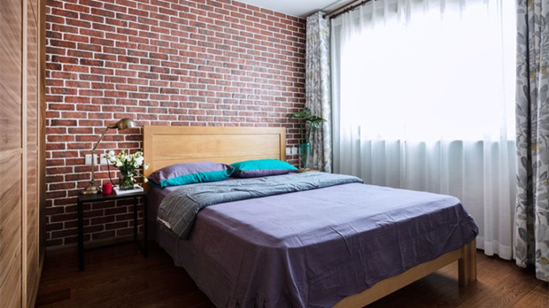臥室同樣采用磚紅+紫色的暖色搭配,通過巨大的玻璃窗,給室內(nèi)帶來了豐富的觀賞美景之外,還能保證室內(nèi)的采光性。深色木地板、黑色吊頂、鋼筋結(jié)構(gòu)的幾何裝飾,組合成了富有個性的工業(yè)風(fēng)格。