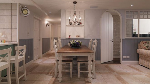 客廳與餐廳與廚房處在一條直線上,視野上沒有任何阻礙,顏色過度自然,由原木色過度至溫暖的粉藍(lán)色,仿佛被暖暖的棉花包圍,柔軟又溫暖。餐桌頂上的燭臺樣式吊燈,暖黃色的燈光,更添溫暖的居住感覺。