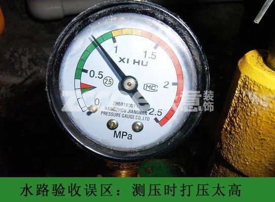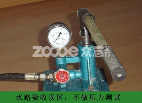 一些業(yè)主為了測試水路承受壓力,將水壓打得很高。但這樣可能會讓管道超過其承受的極限,反而會導(dǎo)致將來出現(xiàn)漏水的危險。正確的方法是,用試壓泵對水管進(jìn)行打壓試驗(yàn),一般試壓壓力要不低于0.6MPa,一般為0.8MPa,壓力有一定的范圍,并非加的壓力越大越好。