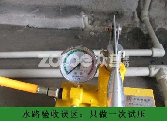 一些業(yè)主在驗(yàn)房的時候,往往出現(xiàn)這樣的誤區(qū),認(rèn)為水路只需要測試一次。其實(shí)只試一次壓并不能完全判斷水路是否正常使用,因?yàn)槭状未驂壕o將管道空氣排出。而多次打壓,能夠不斷地試驗(yàn)出準(zhǔn)確的水路情況。