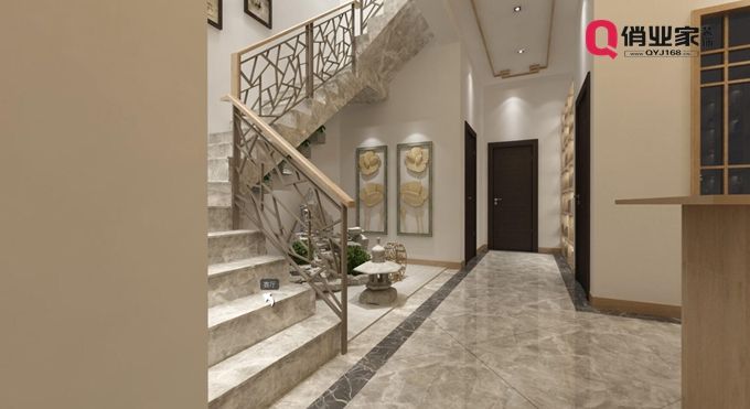 餐廳的裝修設(shè)計中,中式元素與現(xiàn)代材質(zhì)的巧妙兼柔,相得益彰。樓梯側(cè)面的扶欄,選擇用幾何線條組成的冰裂紋,具有較強(qiáng)的層次感,讓原本簡約的空間多了幾分生氣。