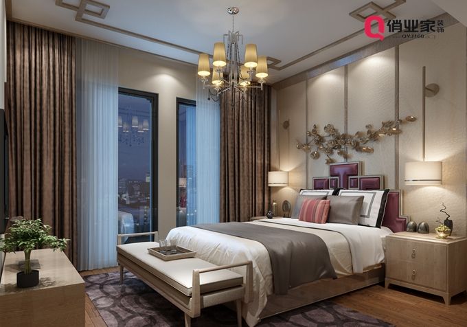 臥室裝修的色彩偏向古典風(fēng)格的華貴,通過刪繁存精的軟裝搭配手段,流暢地表達(dá)出中式文化的特點,使臥室空間在精致效果中滲透了幾許中式簡約氣息。