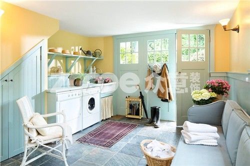 田園風(fēng)格一直都被不少人所喜愛,除了養(yǎng)眼之外,田園風(fēng)格帶給人更多的生活的氣息。洗衣房在黃色與淡藍(lán)色的融合的顏色里,就像在日光下的天空般溫暖,給人恬靜的感覺!