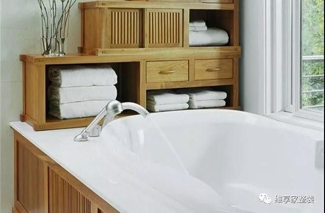 在功能區(qū)的部分,最靈活的無疑是擱架收納了。將擱架放置在浴缸的上面,多層分隔擺放,將靈活體現(xiàn)到極致。
