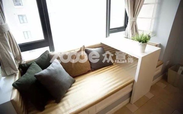 把飄窗設(shè)計成卡座,不要擺桌椅,直接在旁邊地面上鋪一塊地毯或是軟墊,卡座里存放上玩具或書籍,孩子可以坐在地上玩游戲,大人在旁邊的飄窗上看書。