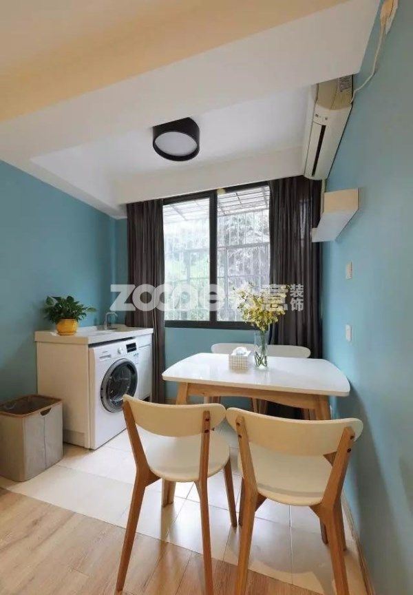 改造后,設(shè)計(jì)師并沒(méi)有完全取消洗衣的功能,在滿足就餐的功能下,保留并從新設(shè)計(jì)了洗衣區(qū)。滾筒式內(nèi)嵌洗衣機(jī)搭配一體式水槽,并把晾衣區(qū)設(shè)計(jì)在戶外,制作了雨棚和升降衣架功能。