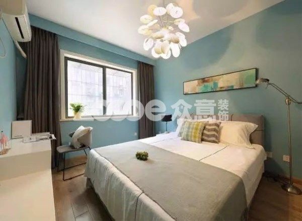 藍(lán)白色系搭配,灰色床品。與客廳區(qū)域整個(gè)空間相呼應(yīng),營(yíng)造簡(jiǎn)約舒適的氛圍。