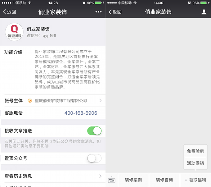 重慶裝修公司俏業(yè)家裝飾自成立初期,就已經(jīng)開通了官方微信訂閱號。簡潔清爽的底部菜單欄,清晰明了。而且由于是微信公眾號,非APP程序,所以不耗手機內(nèi)存。