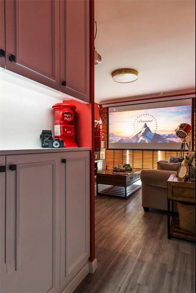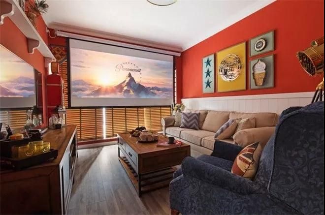 ▲極具現(xiàn)代化的客廳,雖在整體設(shè)計上偏向復(fù)古暖調(diào),但絲毫不影響它整體的前衛(wèi),,不僅配備了120寸家庭影院,同時還把投影儀搬上客廳。