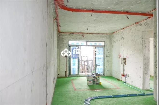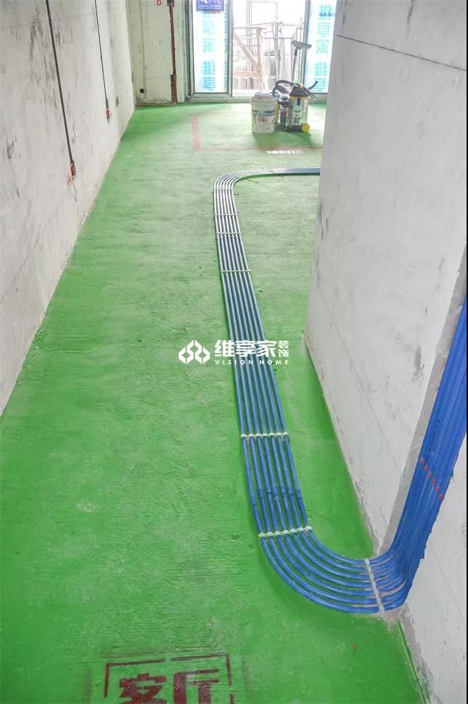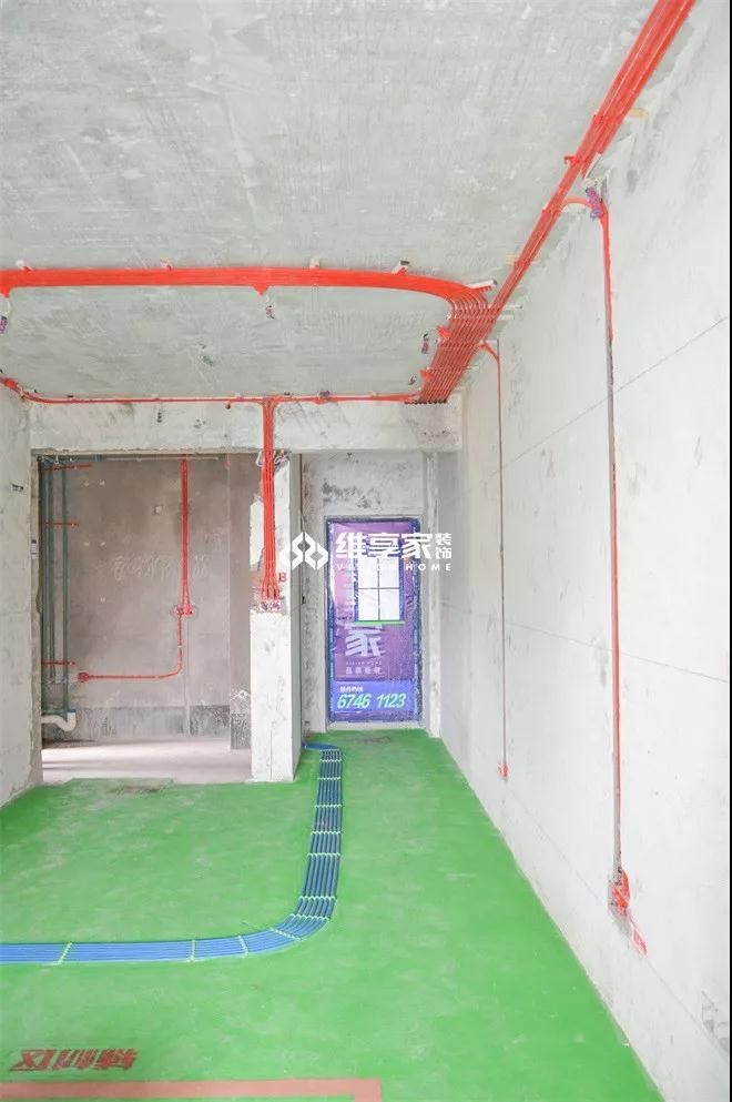 開門往里走,進(jìn)入客廳區(qū)域,整個(gè)房間用綠地固鋪滿,其上線管整齊排列,規(guī)范整潔。