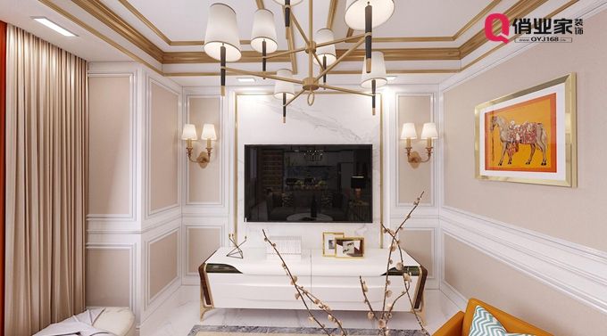 第一種,美式裝修風(fēng)格的背景墻:背景墻設(shè)計(jì)使用石膏線條裝飾勾勒細(xì)節(jié),與整個(gè)客廳吊頂相互呼應(yīng),簡潔卻帶輕奢品質(zhì)。
