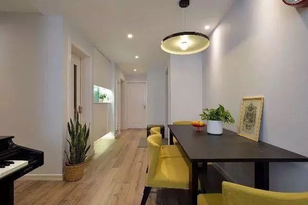 餐廳的地面也是原木地板開放式的布局,顯得空間很寬敞,用黃色的椅子搭配木桌子,帶來(lái)一些活躍的感覺,還在餐桌上擺放了一盆小小的綠植,看起來(lái)清新又可愛。