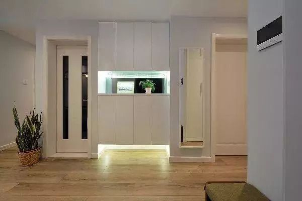 玄關(guān)處擺放了一個(gè)白色的玄關(guān)柜,中間和下面都鏤空,下面可以擺放一些鞋子,上面可以放一些鑰匙、充電器這樣的小東西,也可以擺放一盆綠植來(lái)裝飾空間。