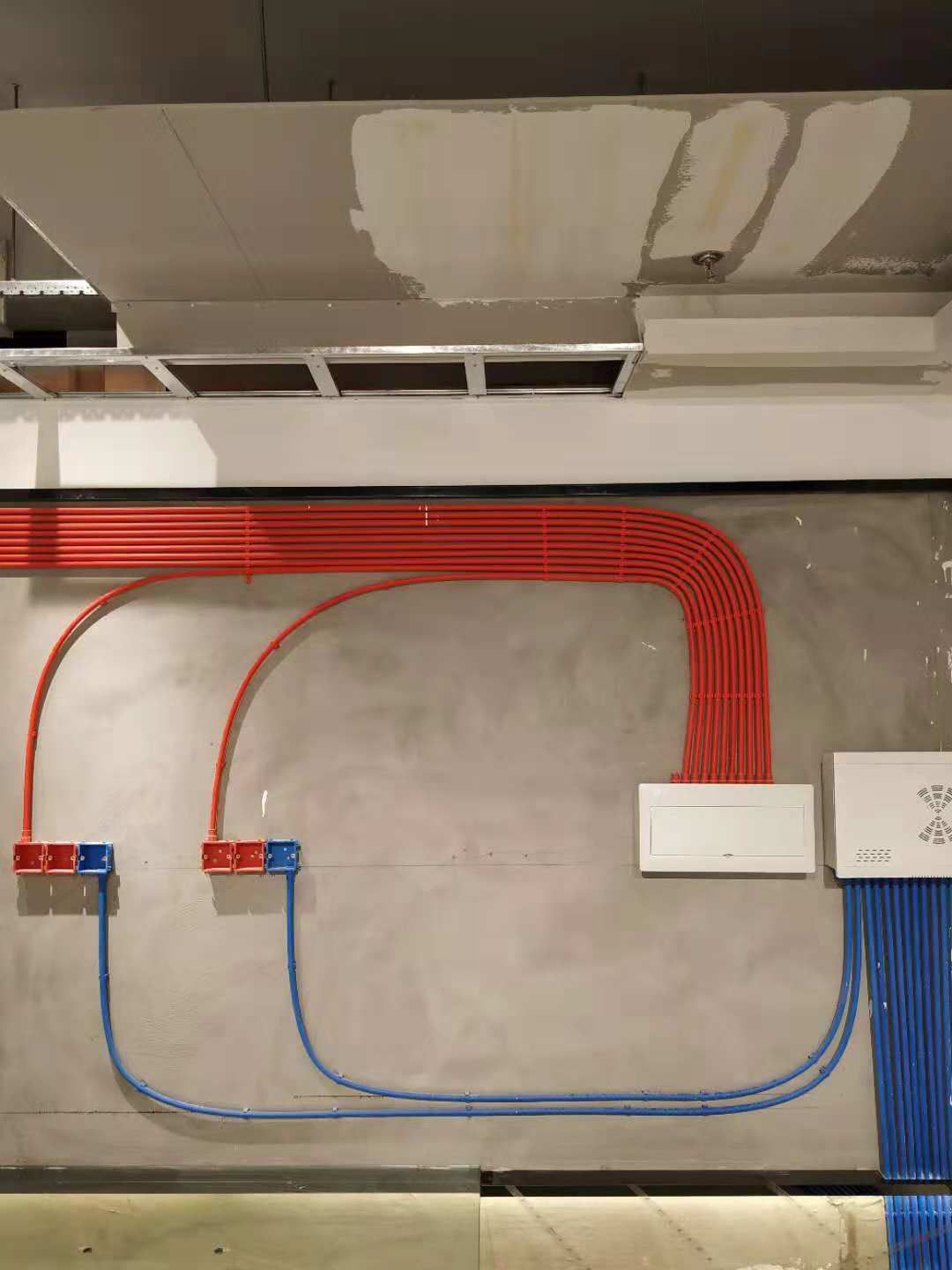 電路規(guī)劃過程中,紅色線管為強電線管走天,藍(lán)色線管為弱電線管走地,排列講究大灣工藝,這樣做既美觀也有效避免強弱電干擾,也方便后期對電線的定位