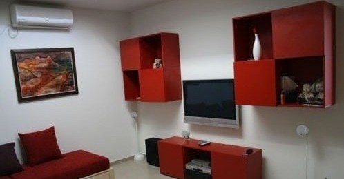 客廳電視背景墻:電視機兩端是方形掛壁式收納柜,有無柜門以對角為劃分,組合單元的紅色與紅色沙發(fā)相映成趣,轉增個客廳顯得十分喜慶。