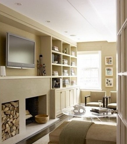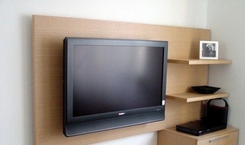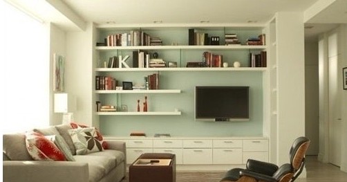 客廳電視背景墻:以倒梯形形式,設計背景墻擱板,梯形頂端空缺位置嵌入電視,擱板上放書、裝飾品等,這樣的長形擱板,選擇幾款合適的書擋,尤為重要。