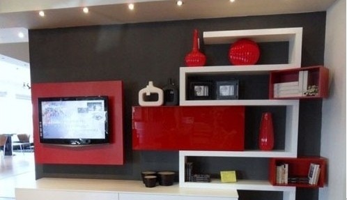 客廳電視背景墻:電視后背位紅色板,內側的展示架造型宛如積木層層疊起,制造出完美的視覺效果,是家中收藏品與裝飾品的良好收留所。