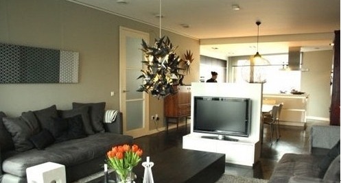 客廳電視背景墻:不被常規(guī)思維所固定,電視不一定僅擺放在墻面上,像這樣的,設計有電視靠板的電視,巧妙的放于客廳中央,不僅節(jié)約空間,還成為了客廳與餐廳的隔斷。