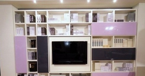 客廳電視背景墻:內含豐富的隔層的電視組合單元柜,擁有柜門的部分是紫色設計,淡雅迷人,最為強大的是這款電視背景墻的收納功能,由于有足夠多的隔層,能夠做到量多、整齊的客廳收納。