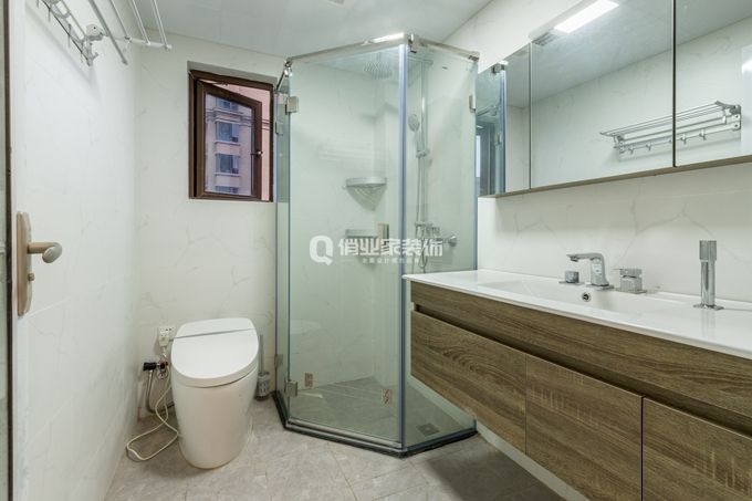 3、如果你是白色控,不妨布置一個(gè)這樣的浴室。白色能增強(qiáng)空間的通透性,對(duì)于空間比較的小浴室來(lái)說(shuō)也是也是一種擴(kuò)容的妙招。如果你的浴室空間較小,不妨采用這樣的擺放方式吧。深色調(diào)的浴室柜為浴室增添更多穩(wěn)重的氣息,多層置物架也能滿足你不同的置物需求。