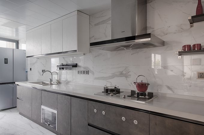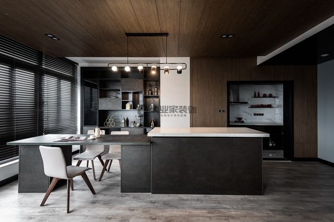 餐廳的用餐桌與功能吧臺(tái)形成高低錯(cuò)感的視覺(jué),增加了空間的高度和進(jìn)深。爵士白的臺(tái)面則營(yíng)造出低奢的現(xiàn)代簡(jiǎn)約氛圍,素雅又帶有逼格。