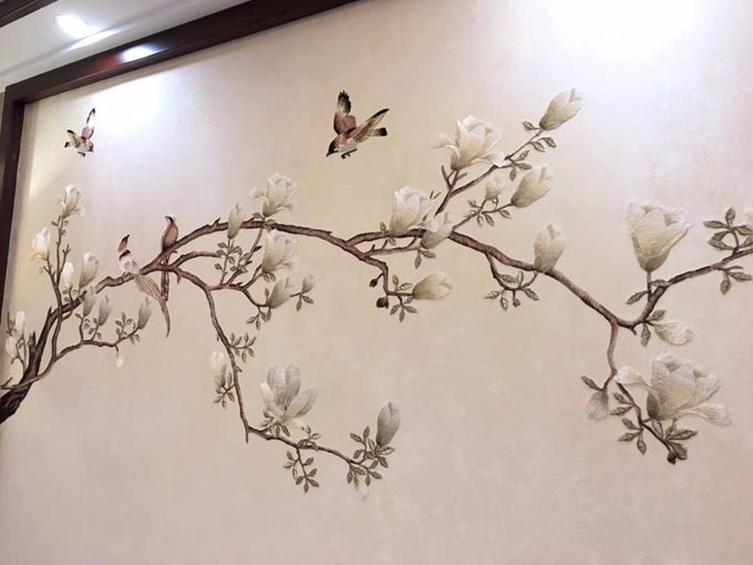 絲綢墻布,就不用小編多說什么了吧,由絲綢織物制成,絲綢材質(zhì)主要以人造絲、柞絲為材料。它外觀看起來和宣紙差不多,但質(zhì)感極佳,非常顯檔次,如果圖案在炫麗一點,裝飾效果會非常爆炸,適合布置在客廳等燈具多的空間。