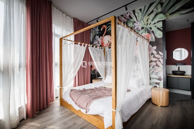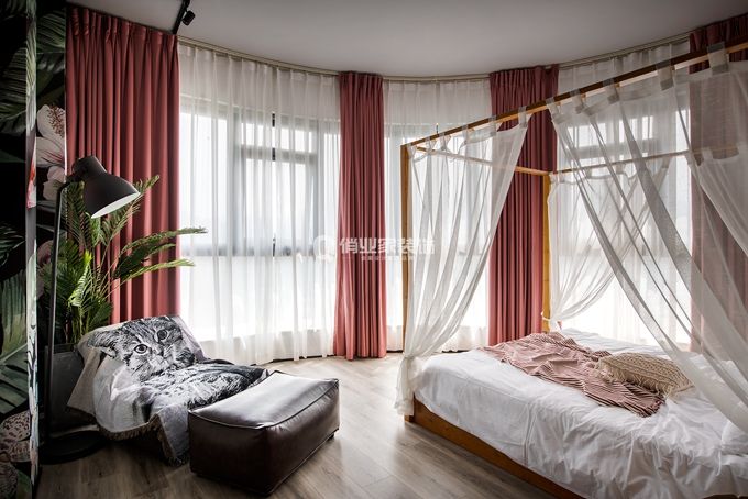 3、臥室套房1裝修:房間全落地窗環(huán)繞,是這個房間的最大優(yōu)勢,視野開闊無遮擋。Ins風(fēng)綠植墻紙,圖案簡單卻帶有治愈性,搭配臟粉大窗簾,讓空間充滿生機(jī),連陽光也變得活潑,幸福感滿滿爆棚!