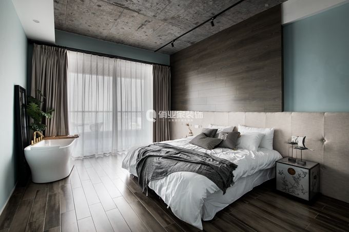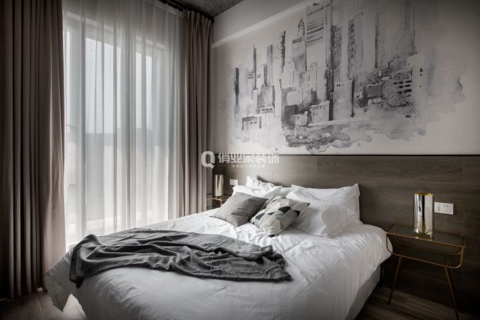 4、臥室套房2裝修:溫潤質(zhì)樸的風(fēng)格同樣打動人心,床頭背景選擇有“山城”之意的水墨畫壁紙,精致時尚的床頭燈、平滑木料的床頭,以及輕盈布藝窗簾…… 質(zhì)感不同的元素在這里演繹出內(nèi)斂輕松的氛圍感。