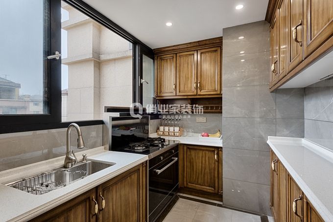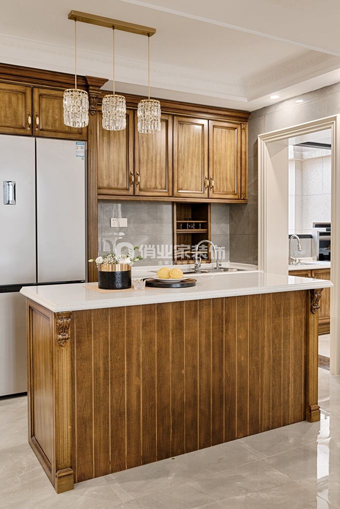3、廚房裝修:改造后的廚房結(jié)構(gòu)呈現(xiàn)中西廚+吧臺(tái)的格局。蜂蜜色系櫥柜和白色石英石臺(tái)面是經(jīng)典不浮夸的搭配,出挑卻又富含質(zhì)感,讓廚房裝修效果也有了生活美學(xué)的靈魂。