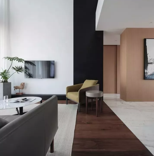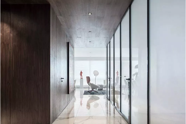 從玄關(guān)開始,深色木質(zhì)與白色玻璃的冷暖碰撞,就讓空間顯得質(zhì)感十足,將視線緩緩牽引至光線明亮的公共區(qū)域。