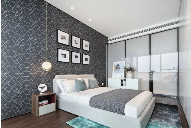 次臥的床頭背景墻是一大亮點(diǎn),采用沉穩(wěn)自然的灰色調(diào)為基底,六邊形金屬網(wǎng)有序交織,營(yíng)造成一道極具視覺吸引力的風(fēng)景線,展現(xiàn)高級(jí)而不俗的藝術(shù)品味。