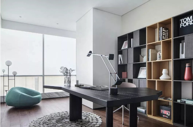 采光充足的書房緊鄰主臥而設(shè)置,中間以一道玻璃移門相隔,大大提高了整體空間的機(jī)能。