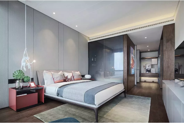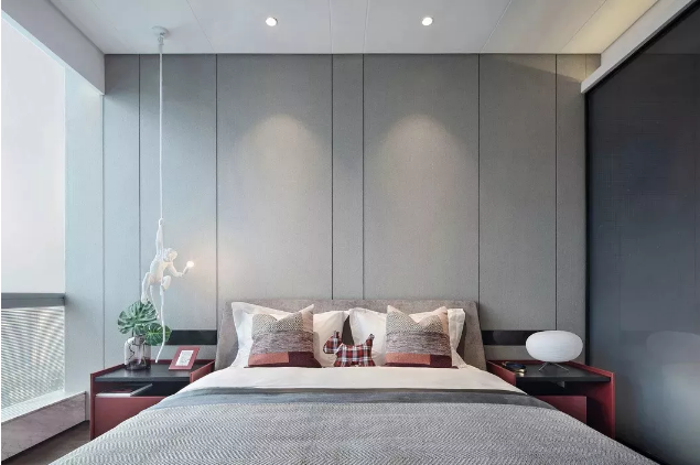 干凈利落的線條由床頭延伸至頂面,呈現(xiàn)出富有韻律的美感,增強(qiáng)整體視覺沖擊力。