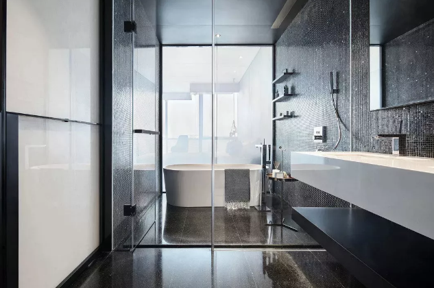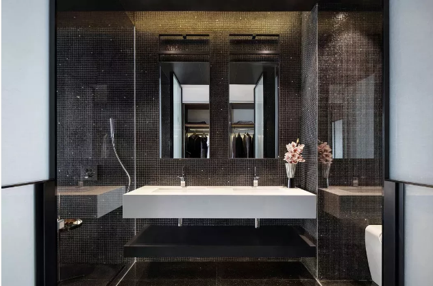 墻面使用深色馬賽克+白色水晶作為點(diǎn)綴,懸浮式鏡面、雙臺(tái)盆以及置物架的設(shè)計(jì),都有效強(qiáng)化空間的立體感與層次感。