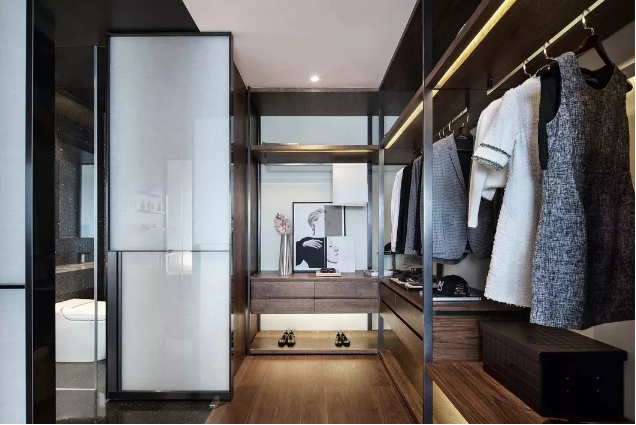 開敞式的衣帽間,恰好處于主臥與衛(wèi)生間的過渡地帶。金屬鋼架結(jié)構(gòu)+木質(zhì)隔板的組合,搭配著隱形的燈帶設(shè)計(jì),讓所有衣物都能一目了然,取放非常方便。